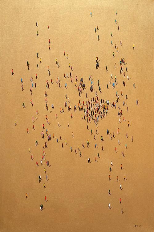 Sus personajes, casi siempre de espaldas o de perfil, despojados de detalles faciales, no requieren identidad individual para volverse espejos colectivos. Con cuerpos mínimos, trazados con contornos negros rotundos, estas figuras pequeñas flotan o caminan sobre fondos intensamente simbólicos. El color no decora: el color en Fontes es atmósfera emocional. El rojo es urgencia, el azul es silencio, el amarillo es nostalgia, el blanco es vacío o promesa.