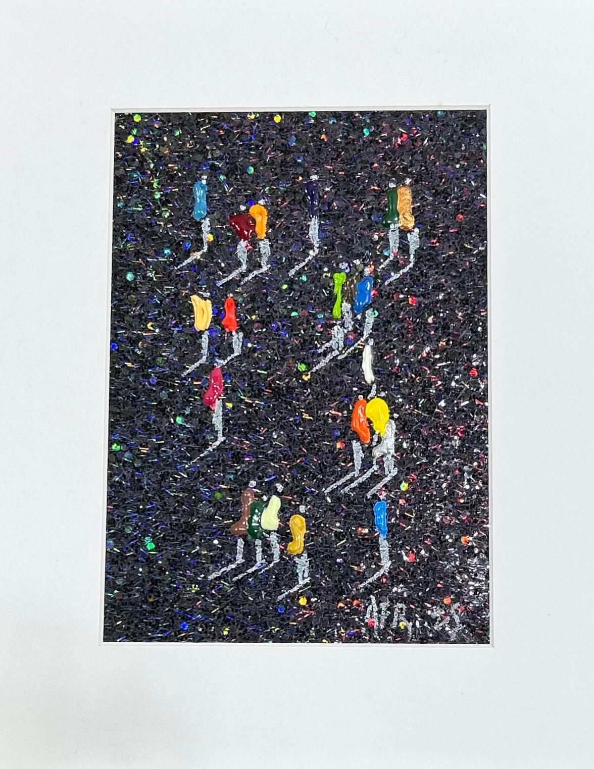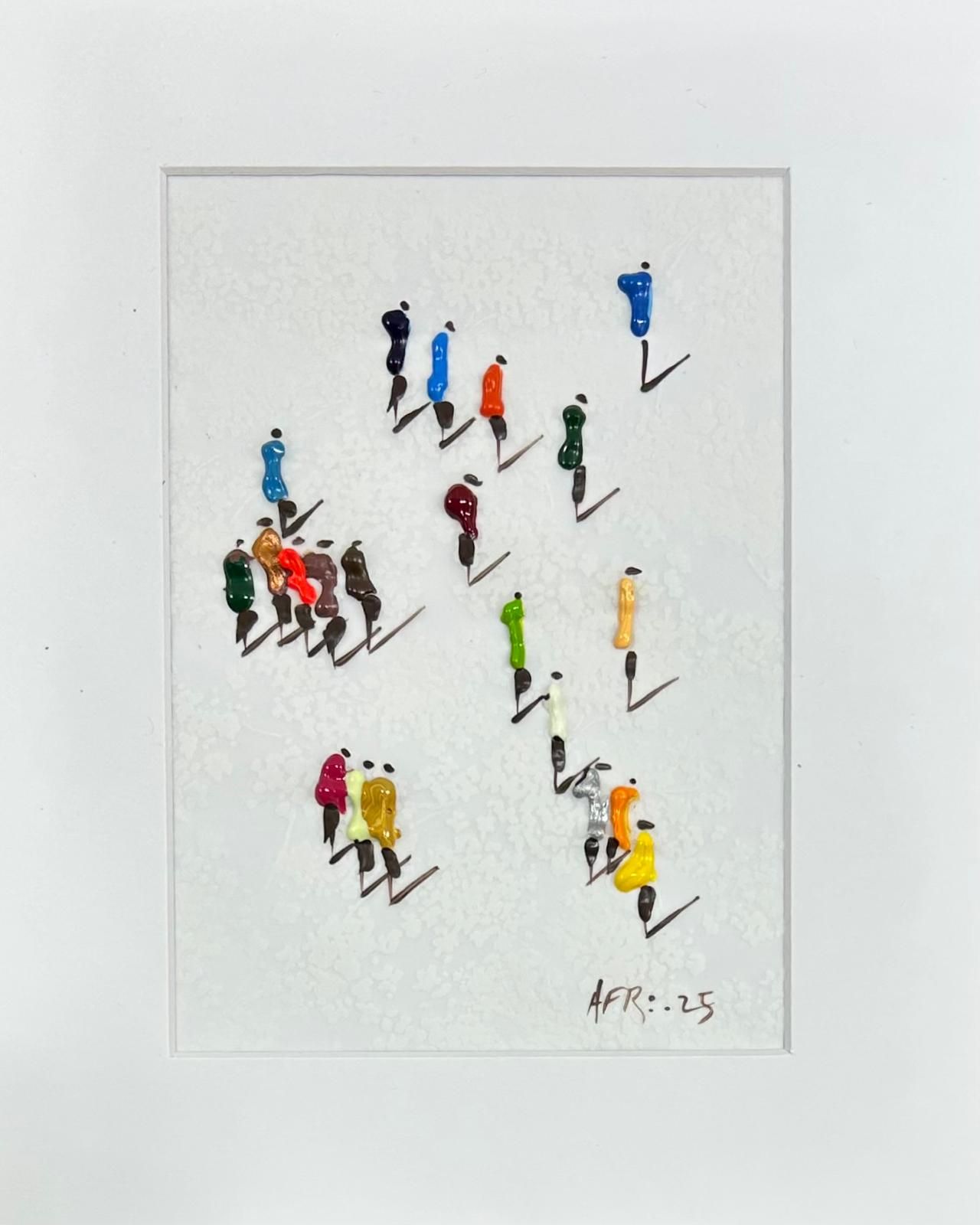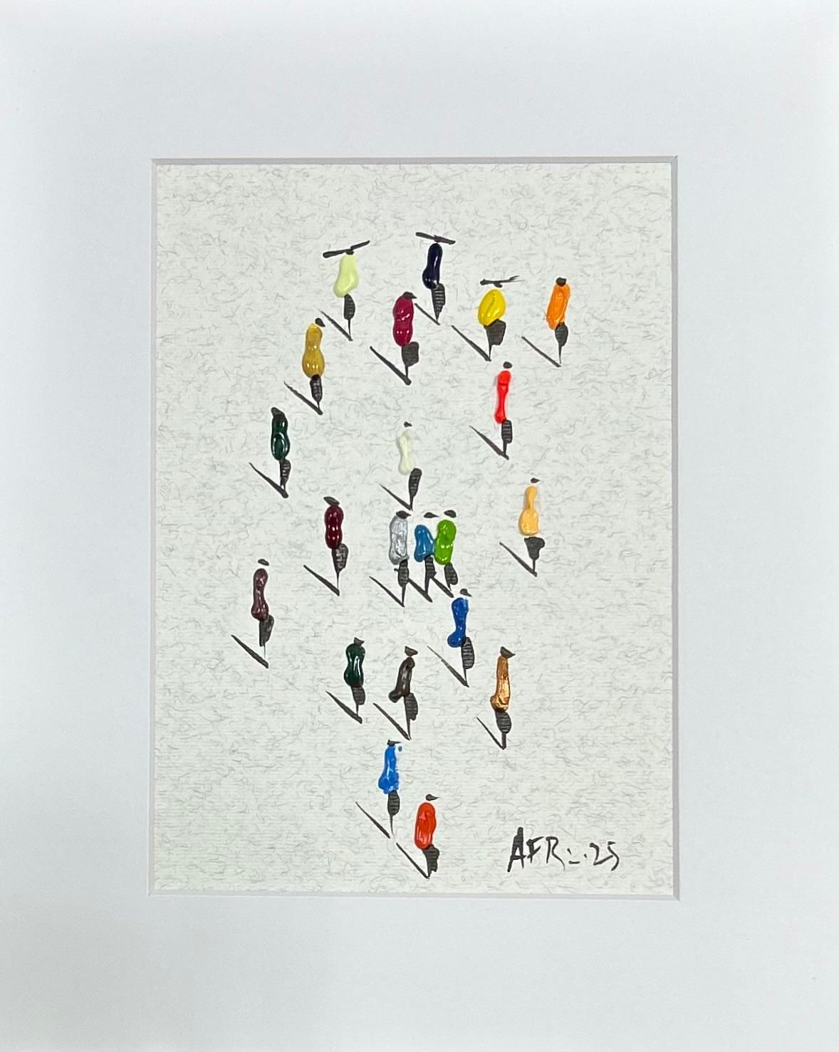 En cada composición, hay un equilibrio entre lo estático y lo narrativo. Nada se mueve, pero todo está en tránsito. Los fondos espatulados y las texturas abruptas rompen la aparente sencillez de las formas, sugiriendo grietas en la memoria, ráfagas del pasado o caminos inestables. No es arte naïf ni pop, aunque flirtea con ambos. Es más bien un lenguaje propio, donde el gesto es síntesis y la geometría es alma.